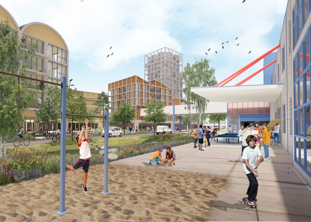 Het bedrijventerrein Oudorp transformeert naar een bruisende stadswijk waar wonen en werken samengaan. Het wordt een levendige plek met een centraal plein vol activiteiten en groen, inclusief voorzieningen zoals een supermarkt en school. Stadserven verbinden verschillende gebouwen rond groene ruimten.