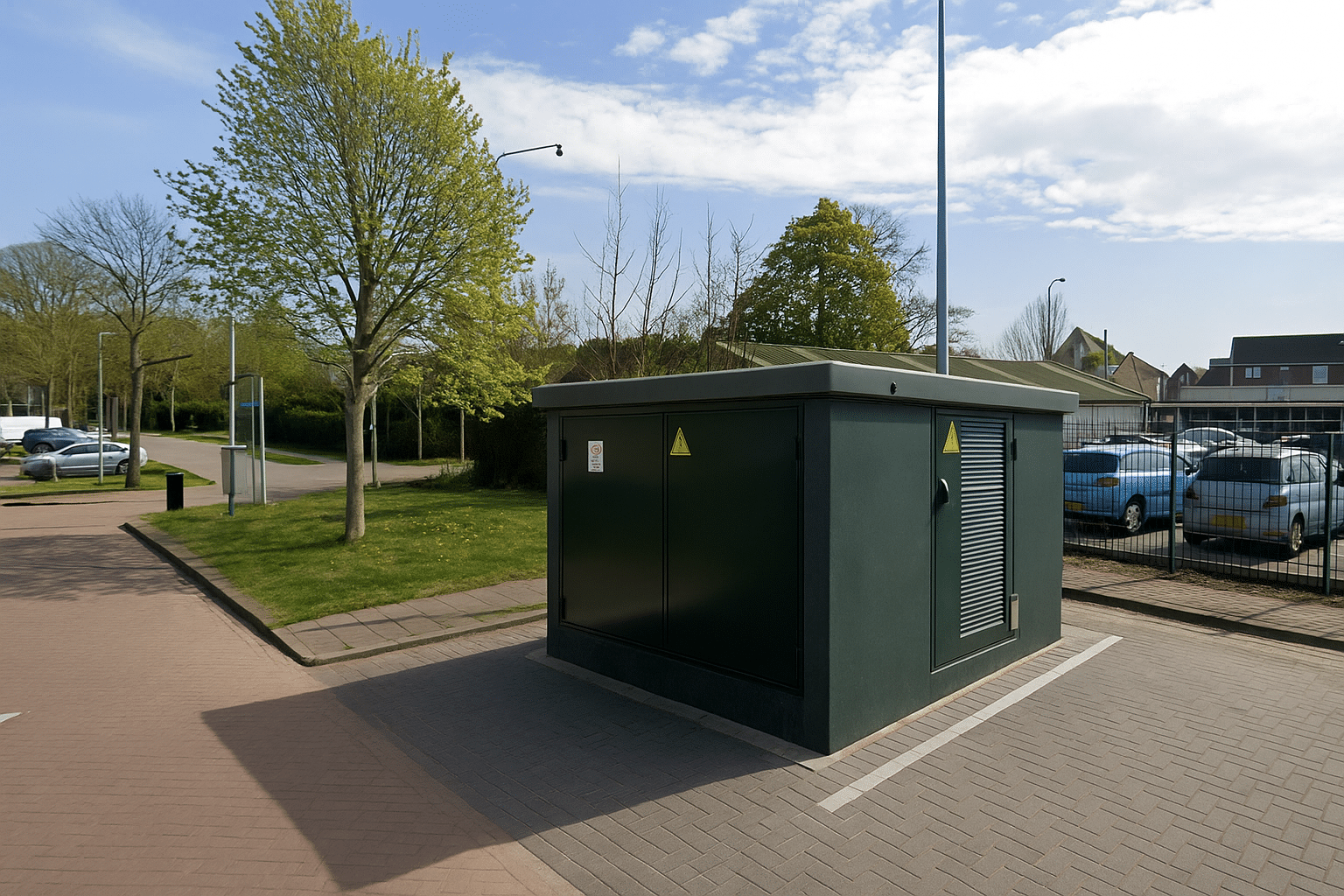 Het elektriciteitshuisje komt op de plek van twee bestaande parkeervakken aan de Koning Willem-Alexanderlaan.