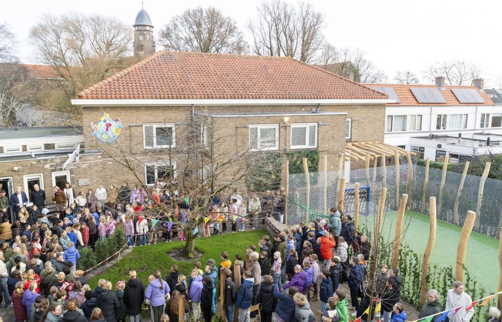 Wat een best ongezellig tegelplein was, is nu een levendige groene plek waar kinderen kunnen klimmen, ontdekken, voetballen en tot rust komen. Op woensdag 10 december is het vernieuwde schoolplein van basisschool St. Adelbertus feestelijk geopend. Wethouder Groen, Jan Hoekzema, knipte samen met leerlingen het lint door. Het plein werd volledig op de schop genomen: stenen maakten plaats voor bomen, planten en natuurlijke speelelementen. Een wadi vangt regenwater op, hergebruikte stenen vormen een tribune, en een klimboom van maar liefst 3.500 kilo is het nieuwe groene middelpunt.